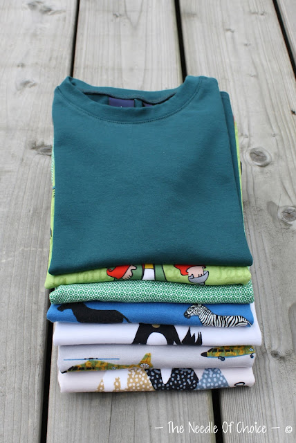 Ik dook in de stoffenkast en haalde er alle tricots uit die wat mij betreft konden dienen voor een t-shirt. Sommige stofjes heb ik al zo lang dat ze ondertussen echt wel te kinderachtig zijn geworden, dus ik moest selecteren. Ik bleef over met 7 stoffen en een paar effen matchende exemplaren. Bandwerk for the win!!